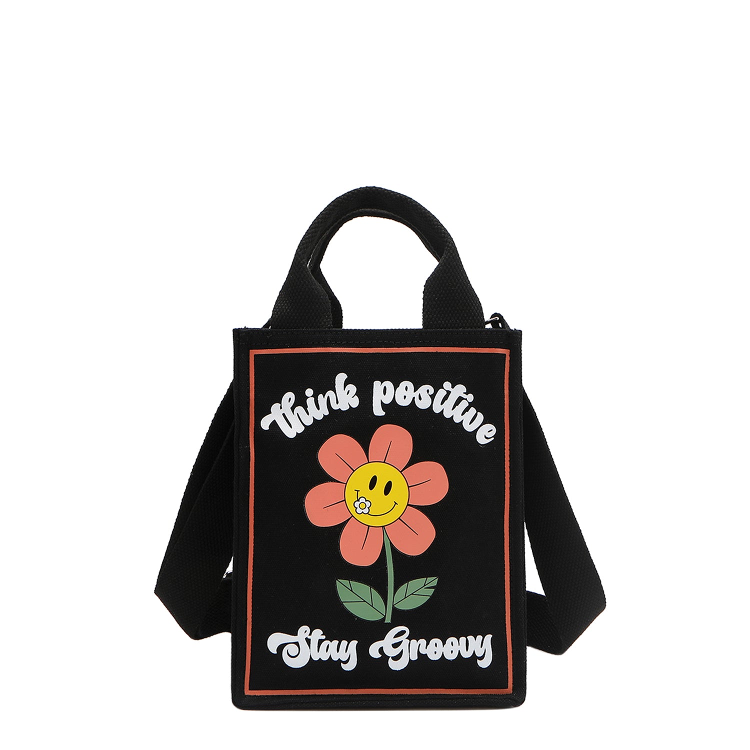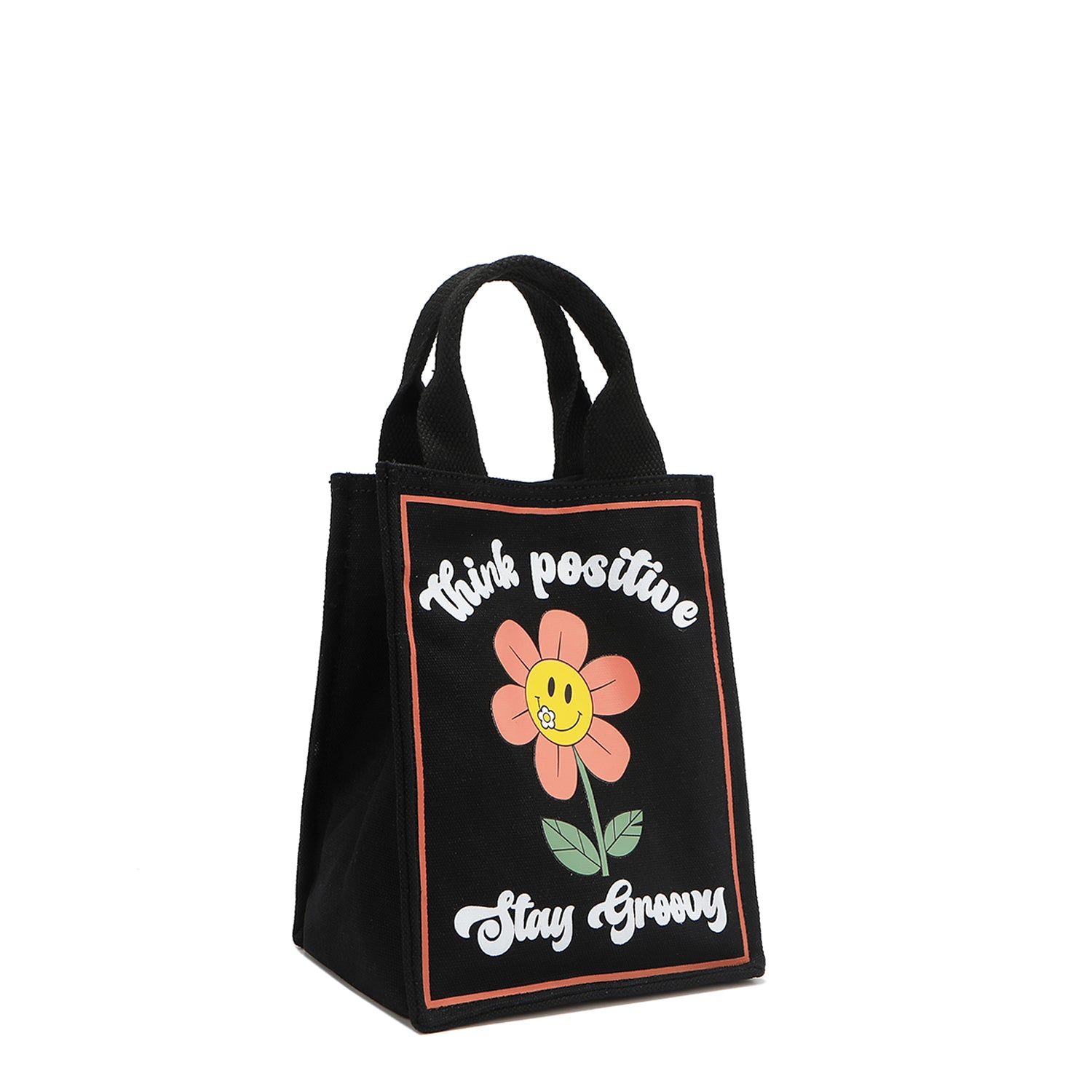 Small tote, major groovy vibes! With its trendy silhouette and uplifting “Think Positive, Stay Groovy” mantra, the Asher bag is your go-to for effortless weekend style. Manifest good energy and channel '70s flower power with this chic, feel-good essential!