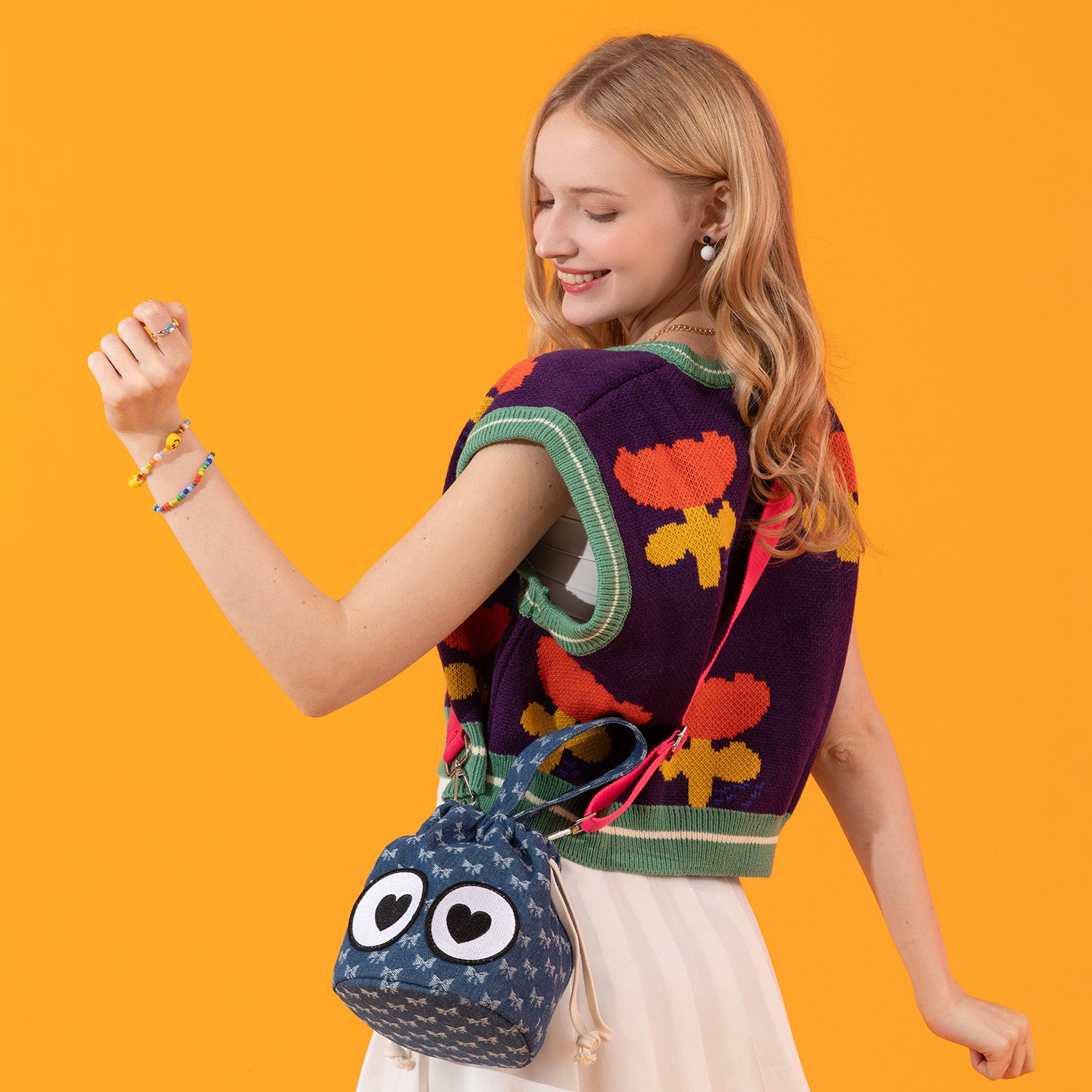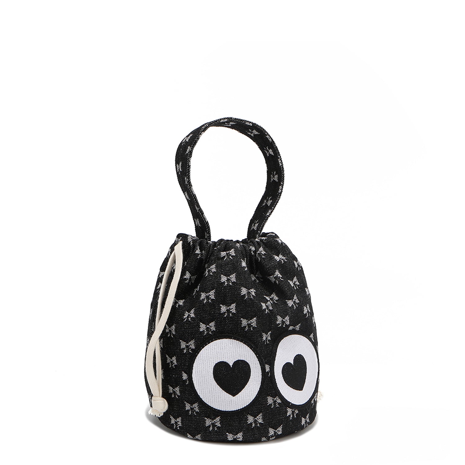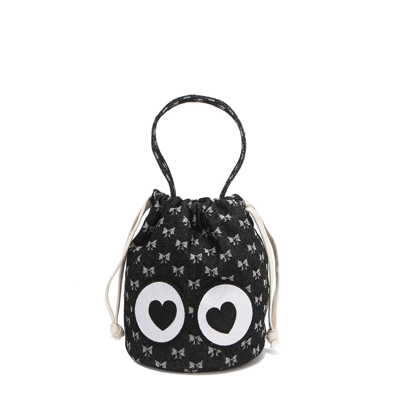 A bag that literally looks back with love! With its slouchy-chic bucket shape, sweetheart bow print, and heart-eye patches that bring it to life, this cutie is bursting with personality. Made from relaxed cotton with a drawstring closure, it’s ready to tag along on all your cutest adventures!
