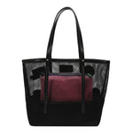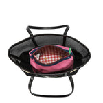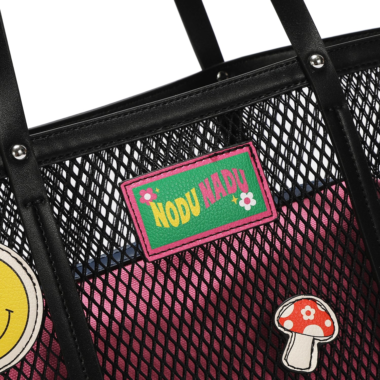 Meet Hallie Bag ! A chic black mesh essential made for summer days. The playful little patches add the perfect vibe, while the spacious pink pouch inside doubles as a crossbody with its strap. Two-in-one, effortlessly cool, and such a steal.